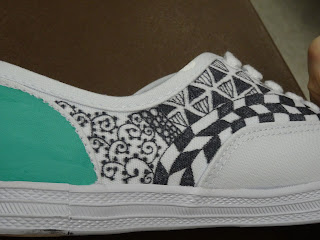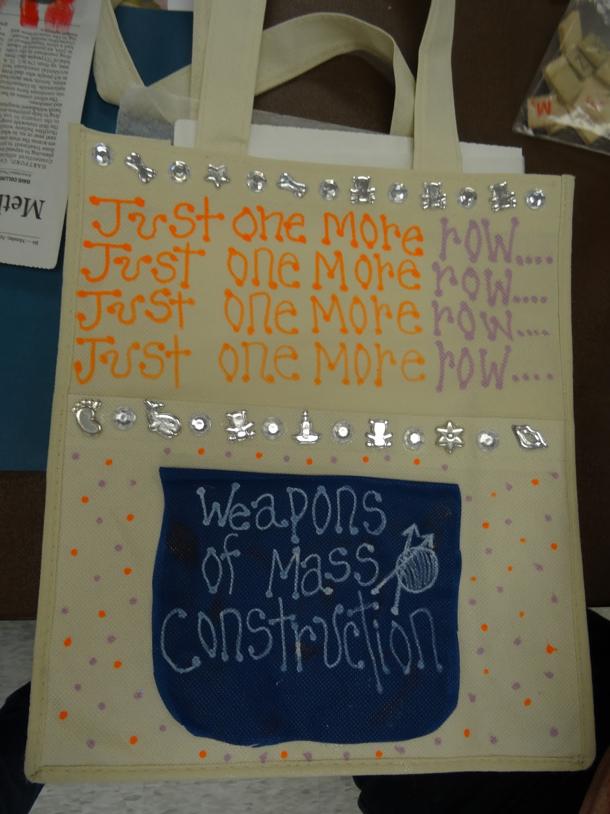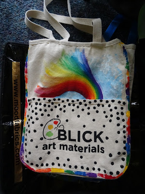 In "my" room, participants were embellishing mostly tote bags, aprons, and shoes. Everyone got to experience everything, switching rooms after lunch.