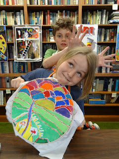 And the final piece of the four, below, is by a 2nd grader. The pieces are all displayed in embroidery hoops. I'm trying to decide whether to let the kids embellish the hoops, by gluing on beads. What do you think?