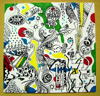 These two lessons above were not stolen; they're mine! A couple of weeks ago, my kindergartners made these fingerprint rainbows. In our next art class, the kids colored a sunshine and painted blue skies. While they were drying, they cut out their rainbows and made some clouds out of bumpy Braille paper that was given to me. Then they glued them all together! Ironically, a few days ago I found a similar rainbow project posted here: http://splishsplashsplatterart.blogspot.com/2011/04/rainbow-finger-painting.html. I guess that's proof that our brains are working in parallel universes!